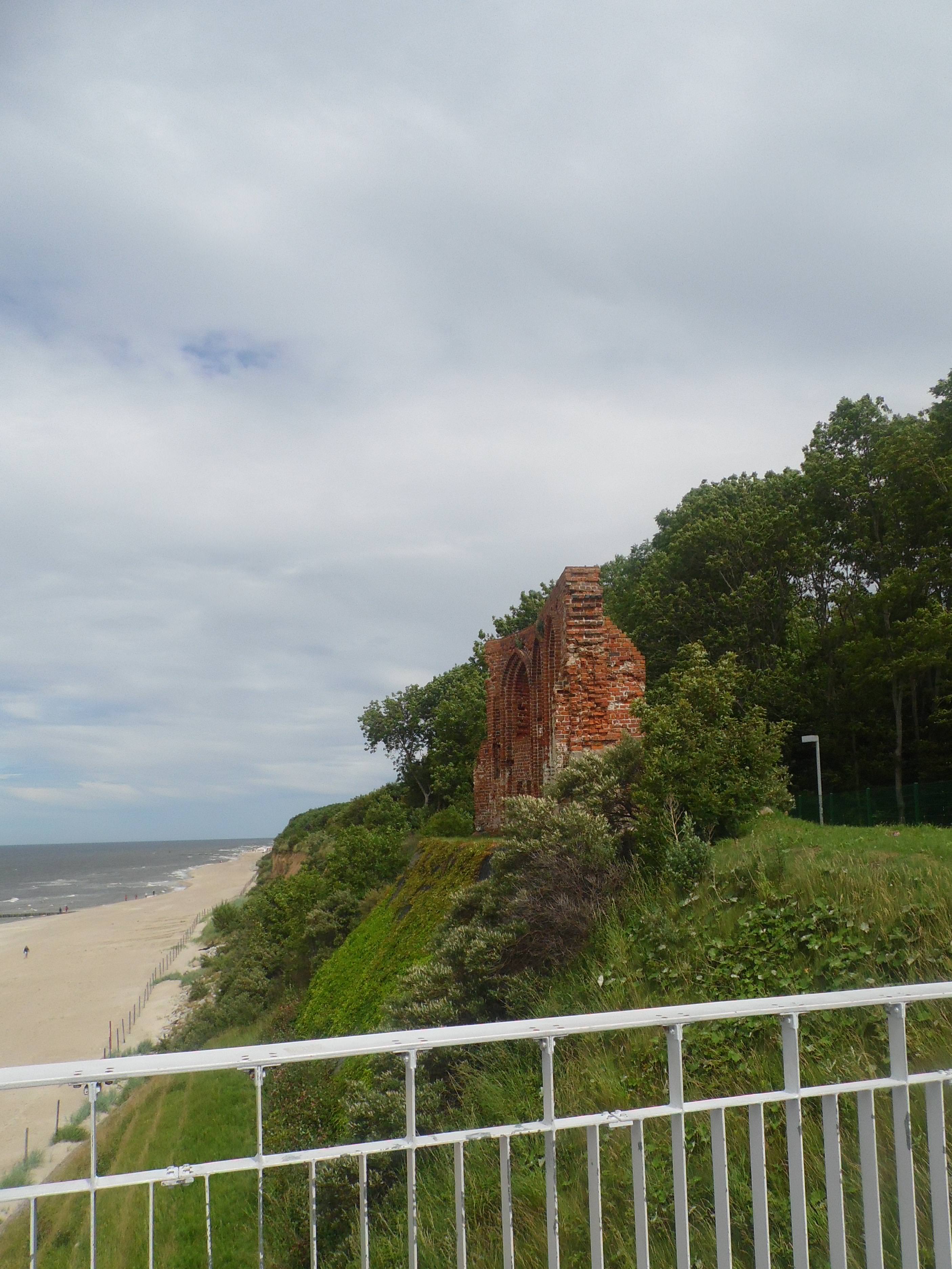 Ruiny kościoła – najbardziej znany zabytek miejscowości. Kościół został zbudowany w głębi lądu (ok 2 km od brzegu morskiego) na przełomie XIV i XV wieku, z biegiem czasu zaczął się niebezpiecznie “zbliżać” do Bałtyku, w miarę niszczenia brzegu morskiego przez procesy abrazyjne. W XVIII wieku, kiedy odległość kościoła od Bałtyku wynosiła już tylko kilkadziesiąt metrów, podjęto próby zapobieżenia dalszemu posuwaniu się procesu niszczenia klifu, ale zastosowane wtedy środki nie na wiele się zdały. Wiek później kościół – niemal dosłownie – stał nad przepaścią; ostatnie nabożeństwo odprawiono w roku 1874, kiedy odległość od morza wynosiła około … 1 metra. Ostatecznie runął do morza na przełomie XIX i XX wieku. Do chwili obecnej zachowała się jedna niepełna ściana, a brzeg morski zaopatrzono w system zabezpieczeń, mających zapobiec ostatecznemu zniszczeniu świątyni.